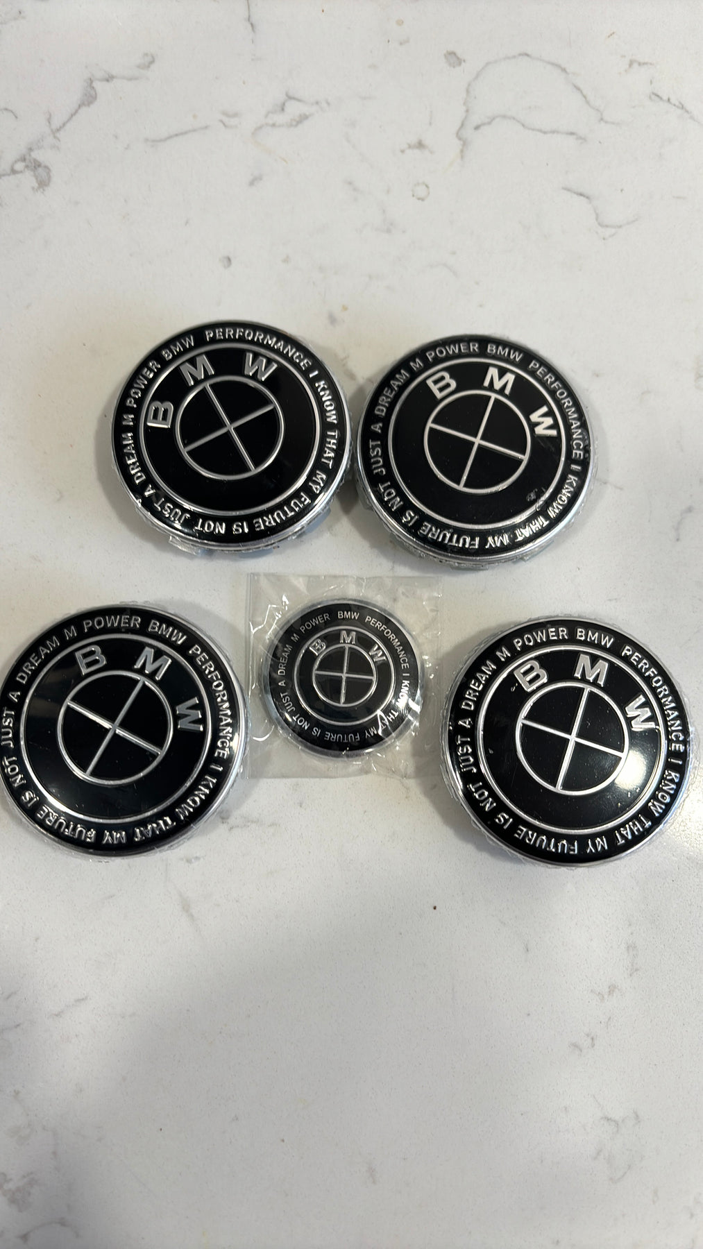 5 piece 5x120 68mm BMW Alloy Wheel Center Hub Caps Set of 4 with Steering Wheel Badge for E81/E87/E88/F20/F21/F22/F87/F23/E90/E91/E92/E93/F30/F31/F80/F10/F11/F25/E70/F15/F16 Models